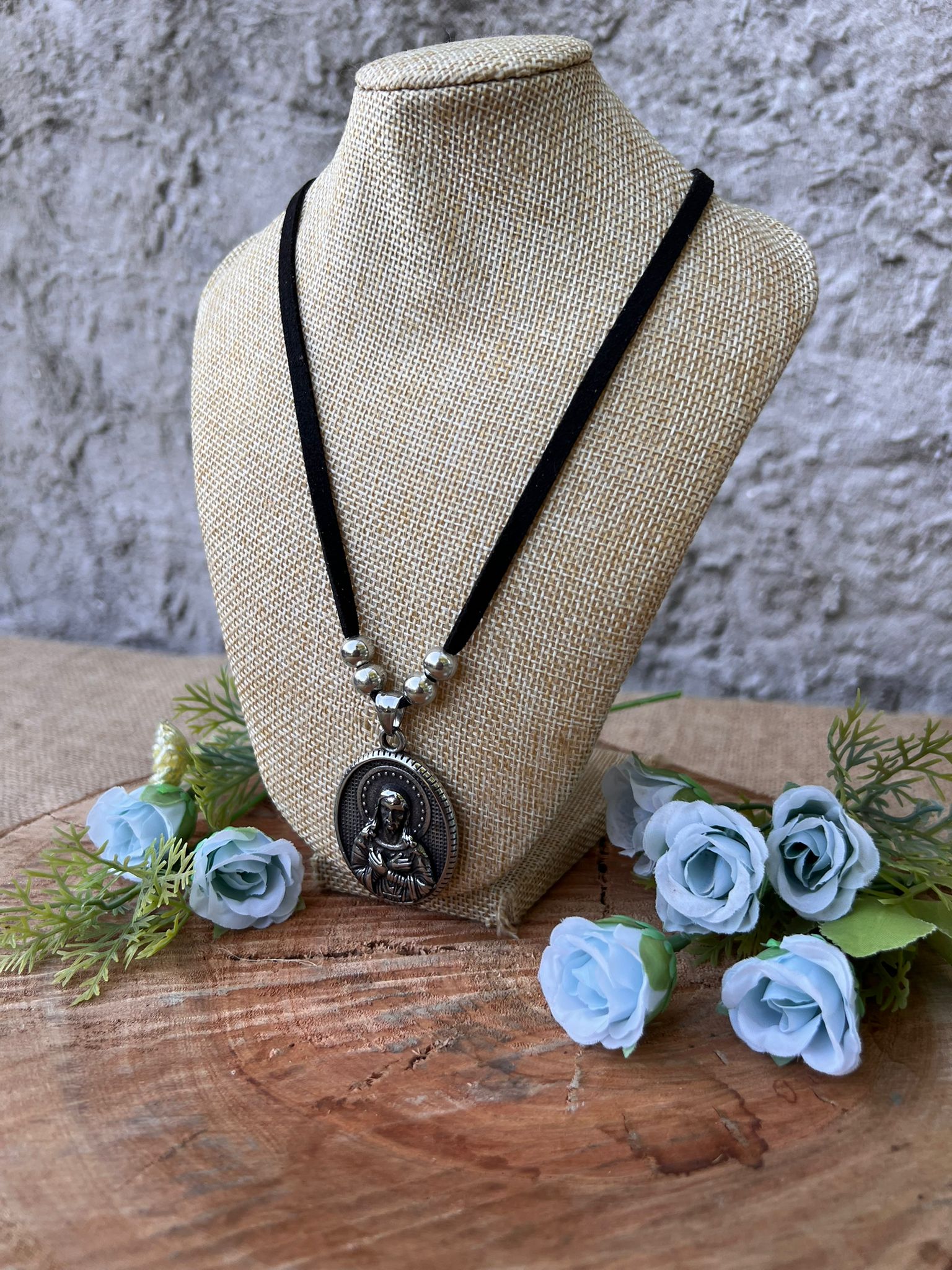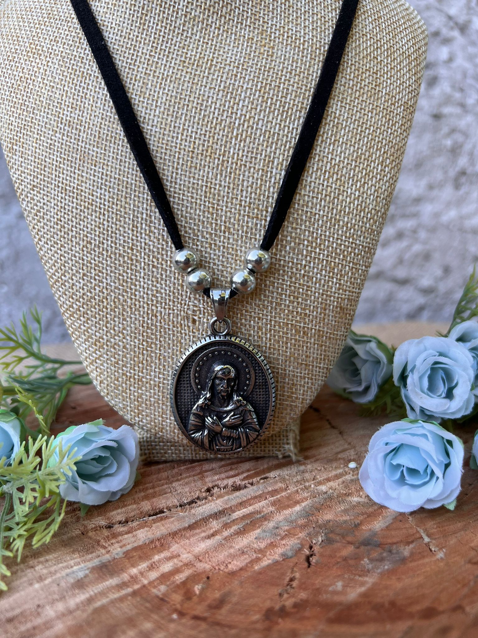 Collar simil gamuza con dije Jesús en acero.