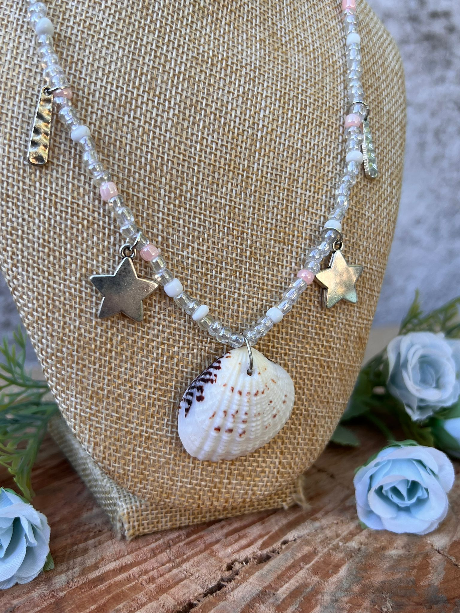 Collar de mostacillas con dijes varios, dije principal: concha natural.