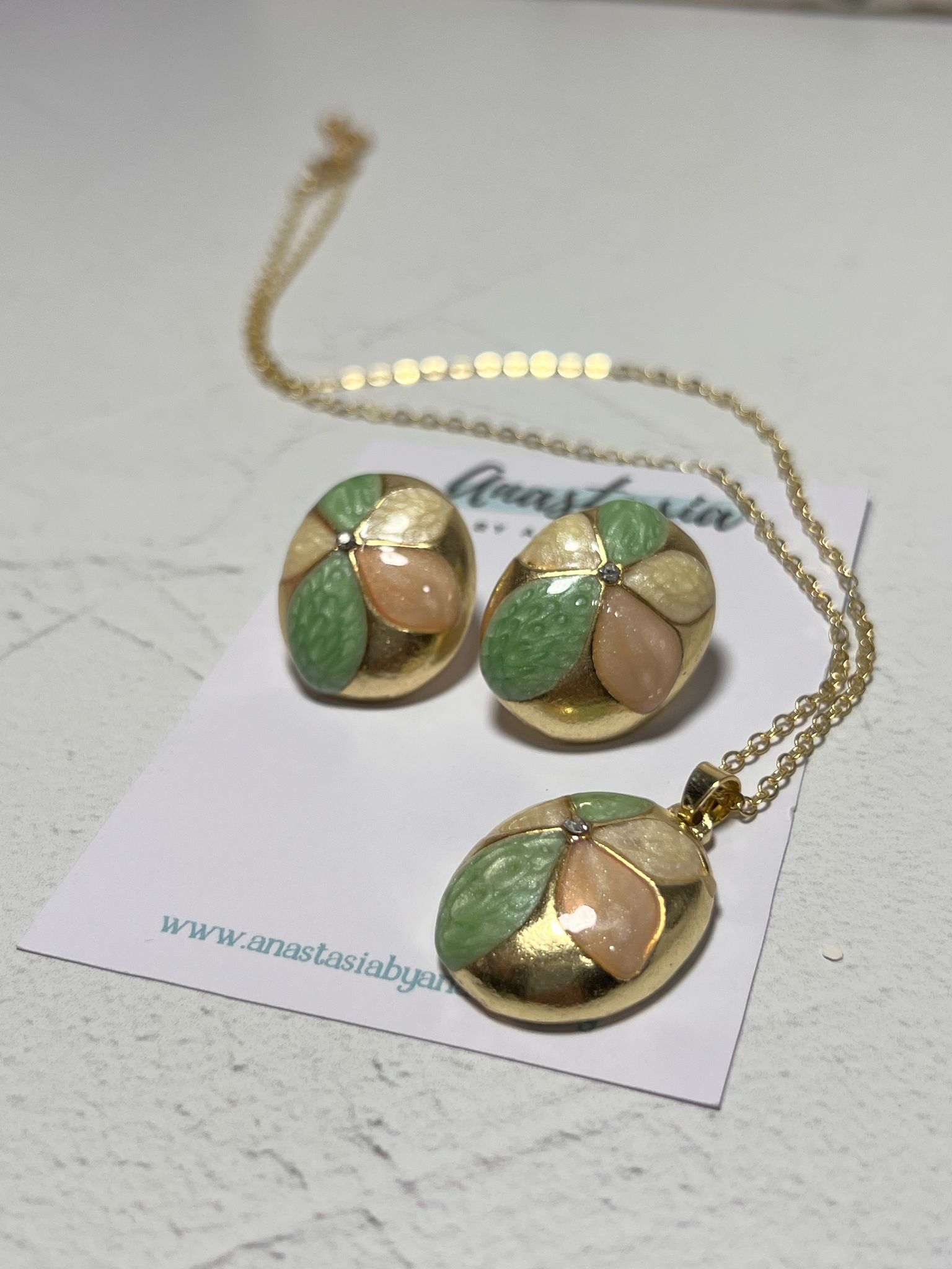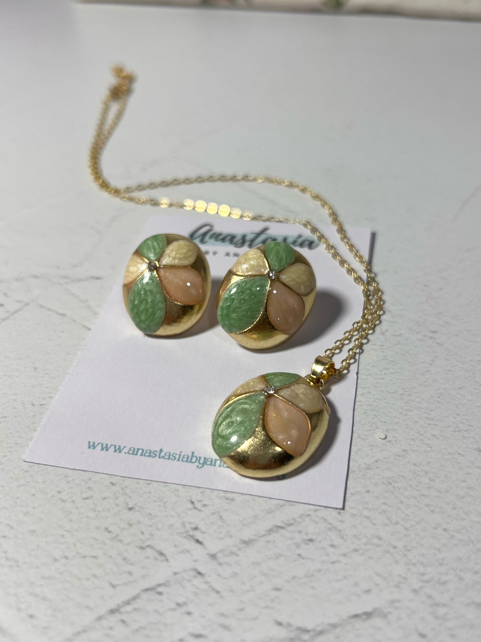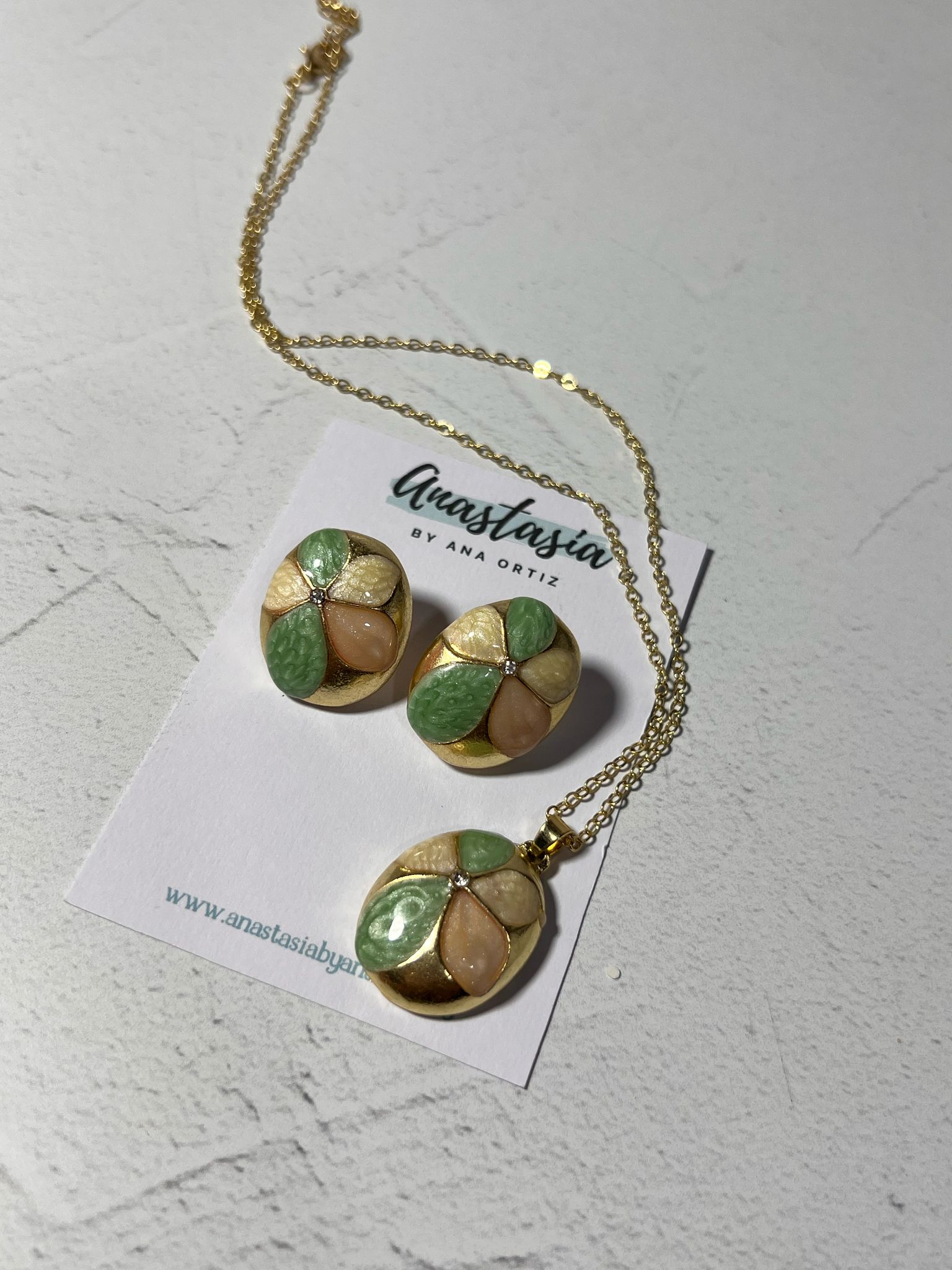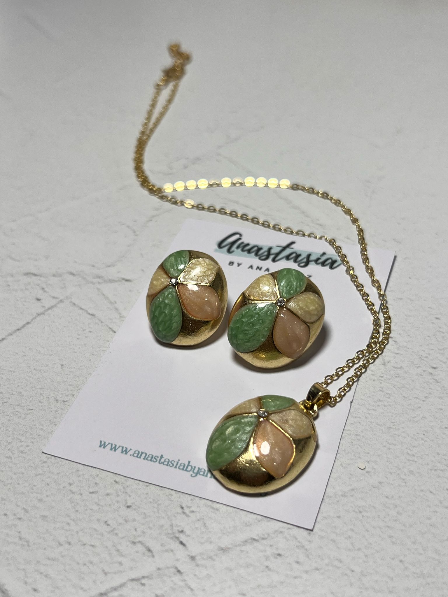 Conjunto de cadena y caravanas. Flor verde y rosada, con detalles en dorado. Livianas y delicadas.