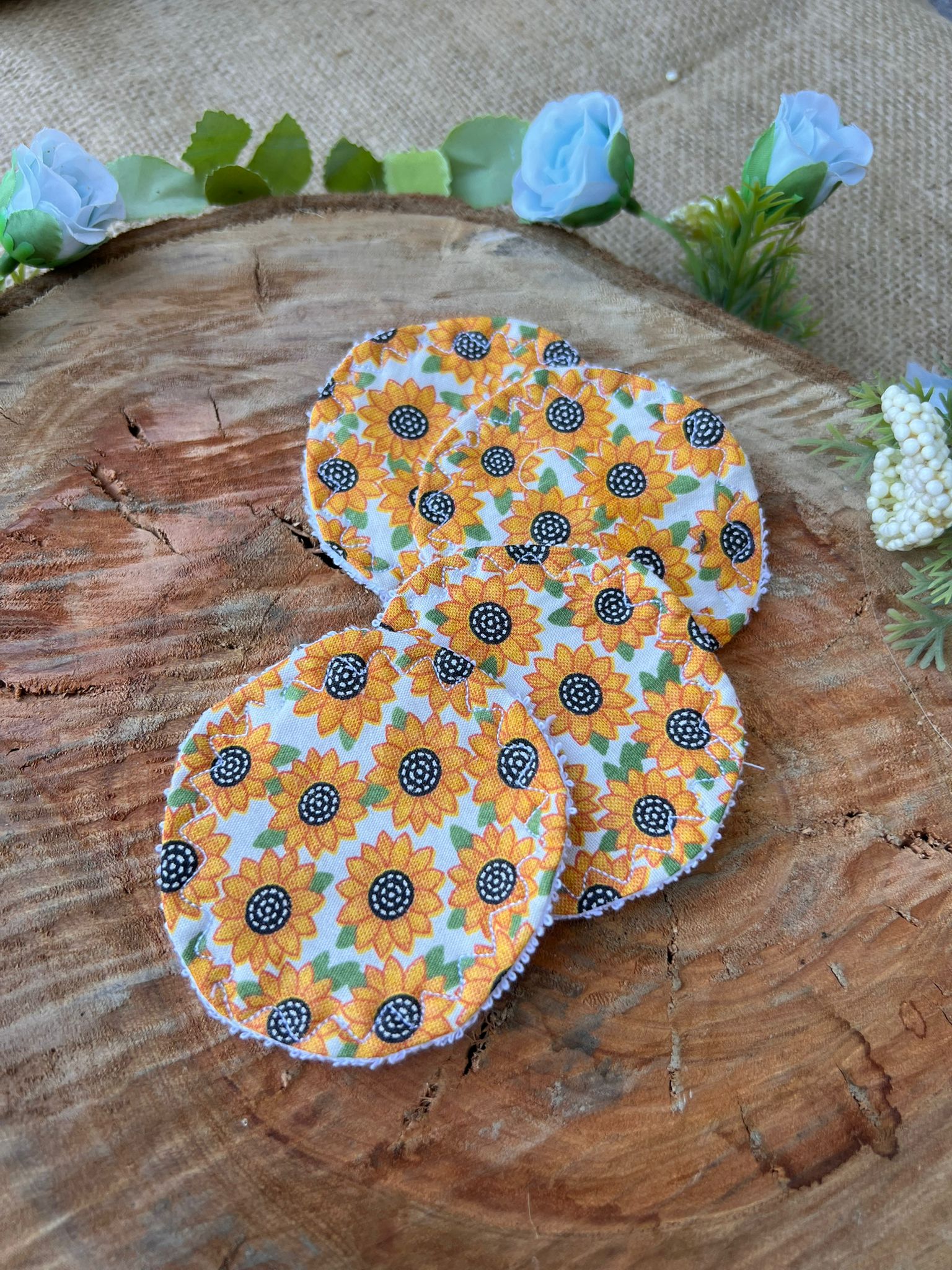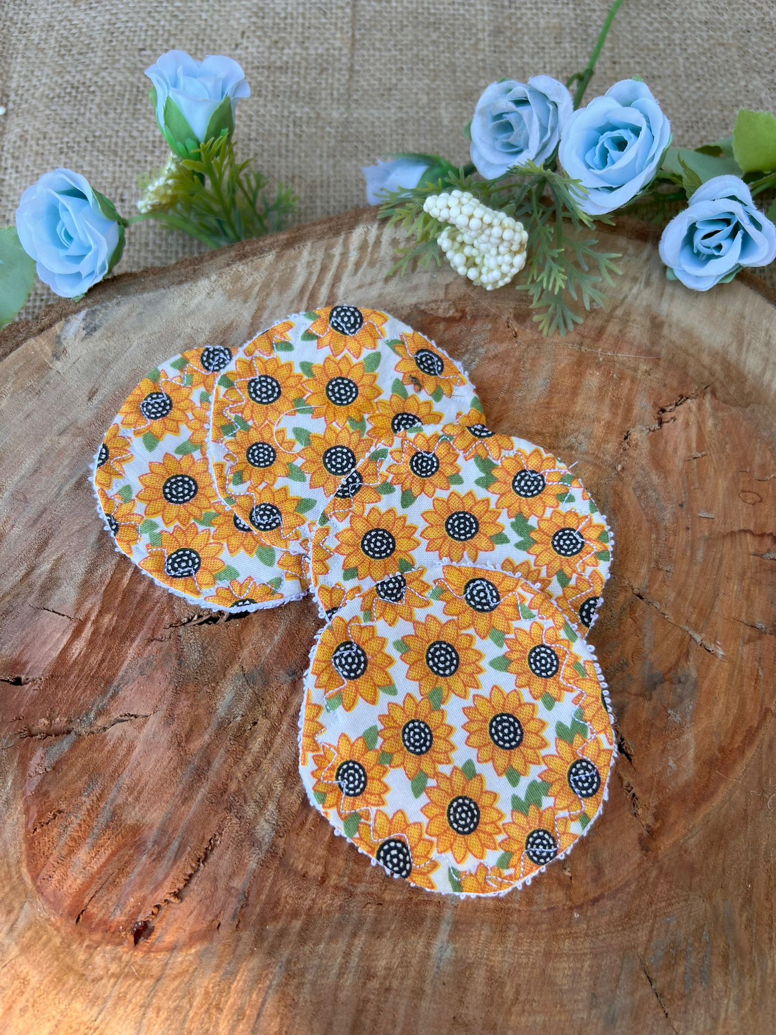 Pack de pads desmaquillantes, tamaño mediano. Pack de 4 pads. Cuidamos al medio ambiente dos veces: 1. cuando confeccionamos el pad, usamos materiales que en otros talleres serian deshechos. 2. cuando los usamos, no utilizamos algodón u otros materiales que se desechan al usar una sola vez.