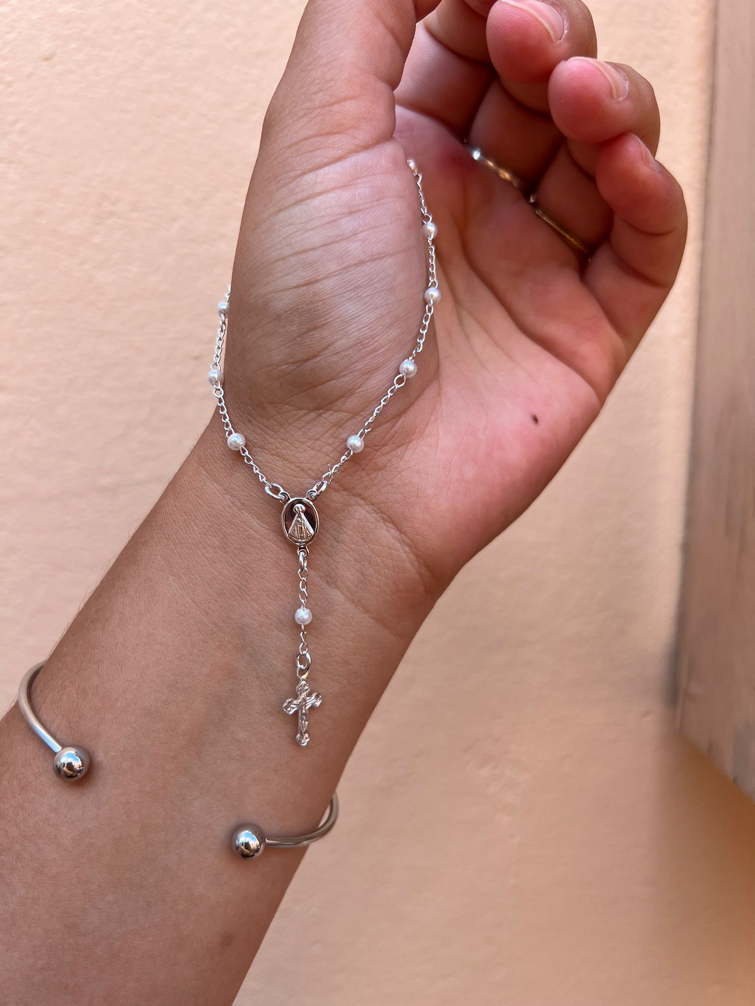 Pulsera rosario enchapada en plata.